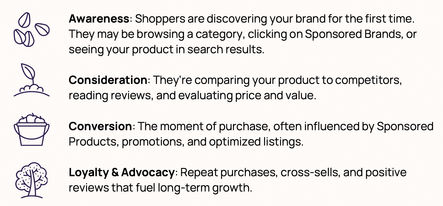 Amazon isn’t just a marketplace. It’s a massive ecosystem where shoppers are constantly discovering, considering, and buying products. Many sellers focus heavily on conversion tactics, but that’s like watering only the leaves of a plant. Without attention to the roots (awareness) and stem (consideration), your growth will stall.